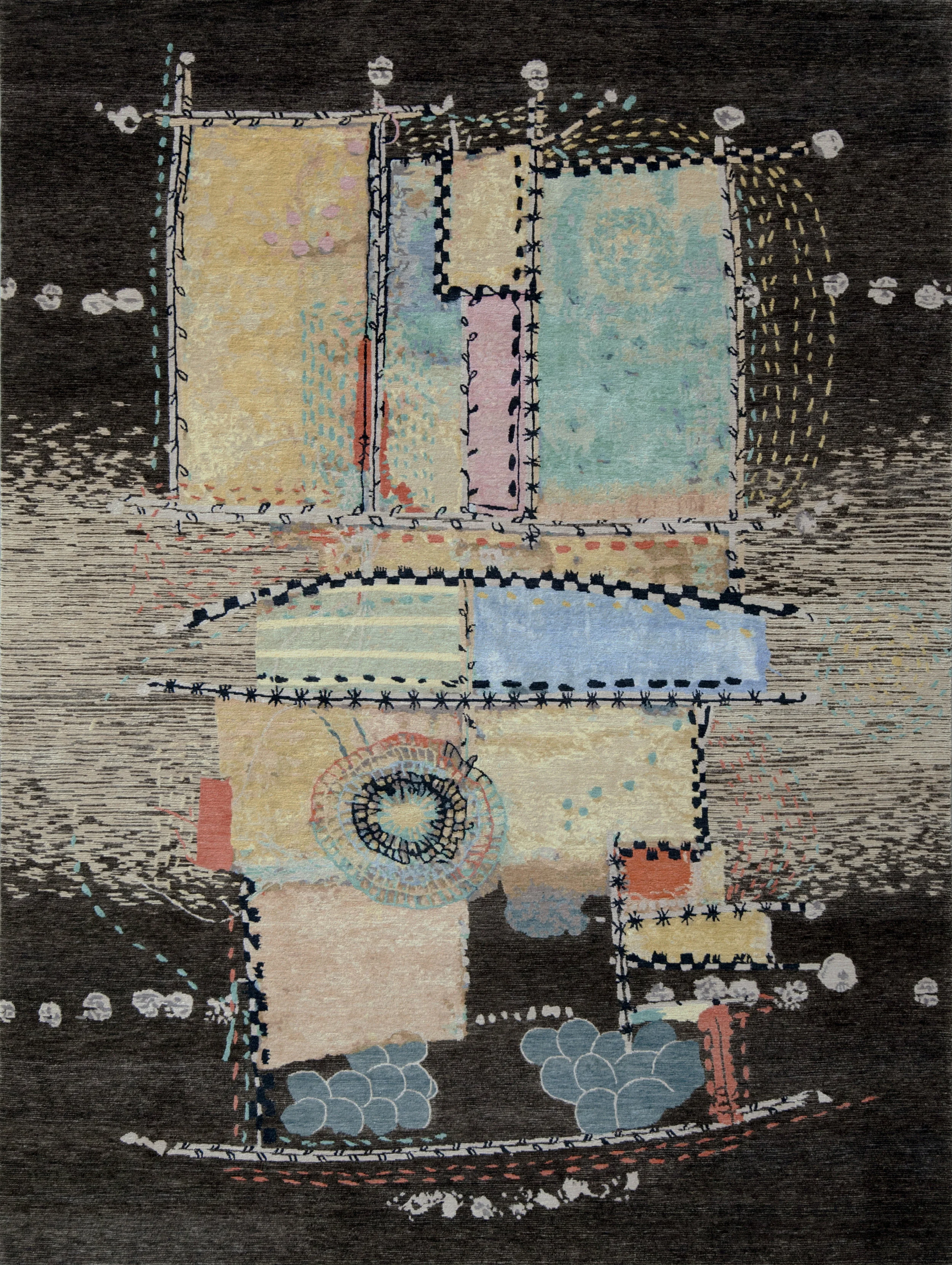 An ongoing theme for this artist is the belief that there is beauty everywhere and life is simple. He is known to be heard saying 'I love what I do'. This rug emanates that feeling. The intersecting patterns and colors seemingly sewn together, just as moments, hours and days converge together to create our lives. Further interest is created by the interposing smooth cut pile of the pattern with the textured cut and loop of the field, another analogy of the road of life.