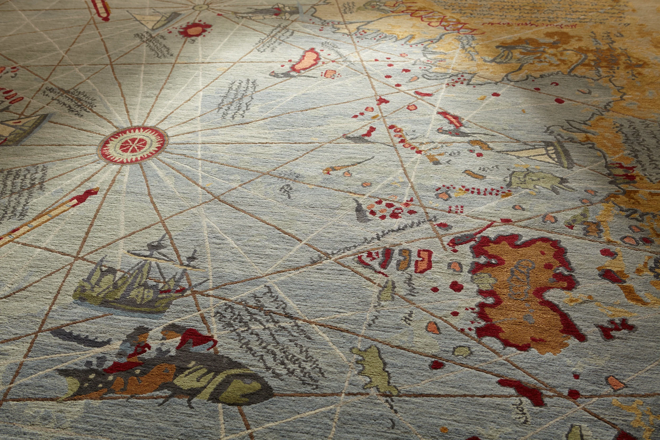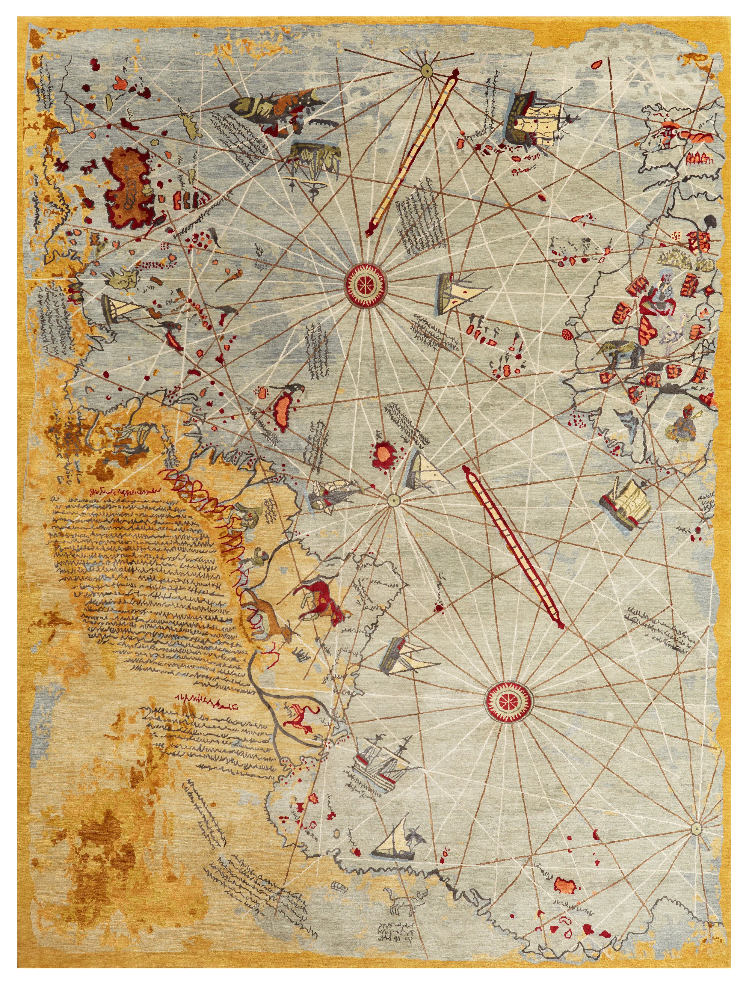 Upon reading about the life of Piri Reis, the famous admiral of the Turkish fleet, the artist became obsessed with the phenomenon surrounding the admiral’s maps. The puzzling question of how this admiral could draw maps of an area, 300 years before it was discovered, haunted this rug designer. Such curiosity led the artist to design this rug, based on Piri Reis’s original map drawn on a gazelle skin.