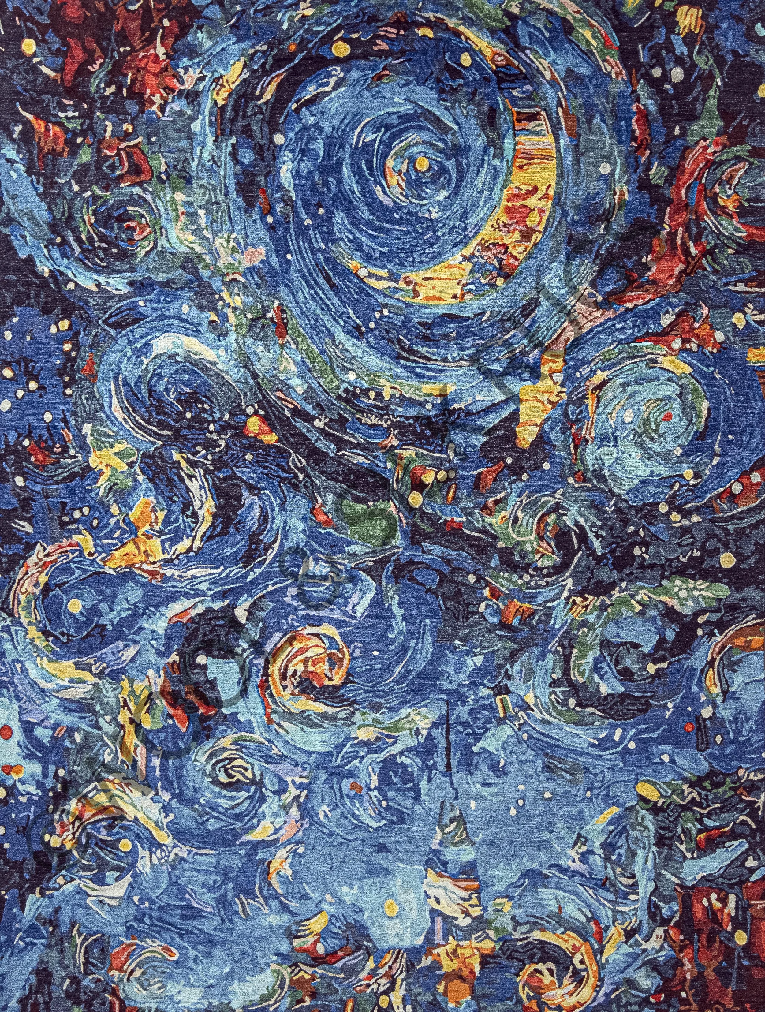 Swirling galaxies of cobalt, gold, and crimson dance across a midnight sky, their luminous currents alive with cosmic energy. A celestial vision woven in wool and silk.